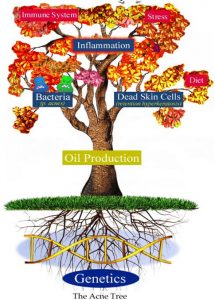 Adult acne is often caused by the overproduction of sebum, an oil created by the skin’s sebaceous glands. It travels up hair follicles to the surface of your skin to act as a lubricant for the hair and skin.
